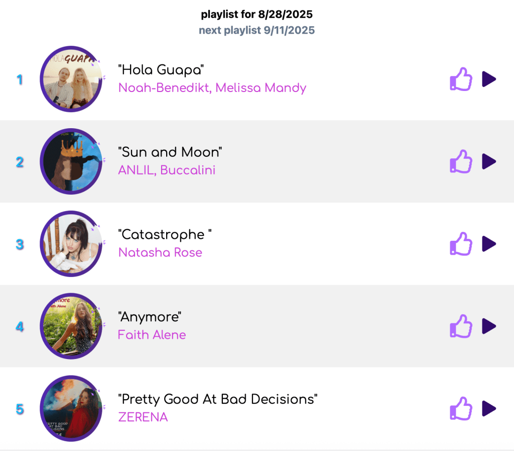 Sun and Moon sits proudly at #2 on aBreak58, sharing the Top 5 with rising artists Noah-Benedikt, Melissa Mandy, Natasha Rose, Faith Alene, and ZERENA